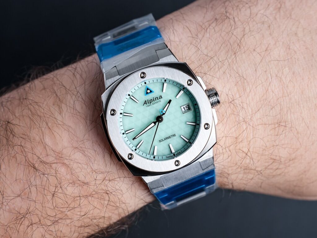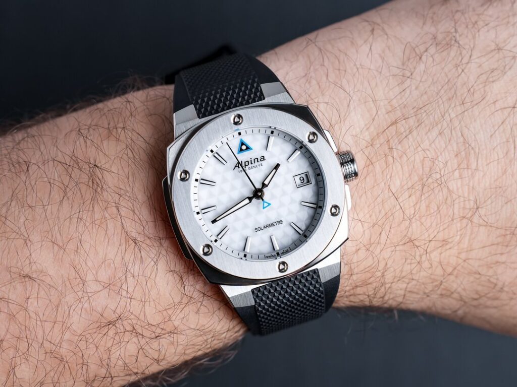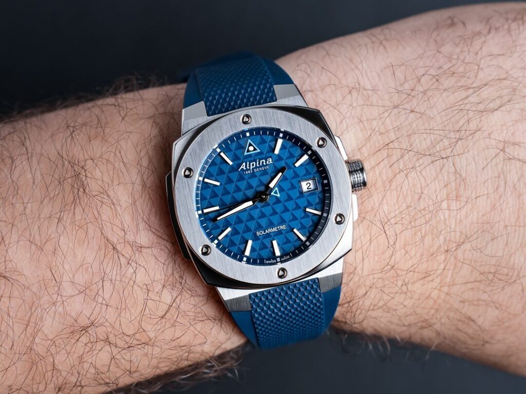 Die Photovoltaikzellen sitzen unsichtbar unter dem Zifferblatt und sammeln dort Licht, ohne dabei das Design der Uhr zu verändern. Ein kleines Detail verrät die verwendete Technik dann doch: der dezente blaue Akzent rund um das Logo bei 12:00 Uhr sowie das Gegengewicht des Sekundenzeigers werden bei Alpinas erster Solar-Kollektion ganz bewusst als Erkennungszeichen eingesetzt.