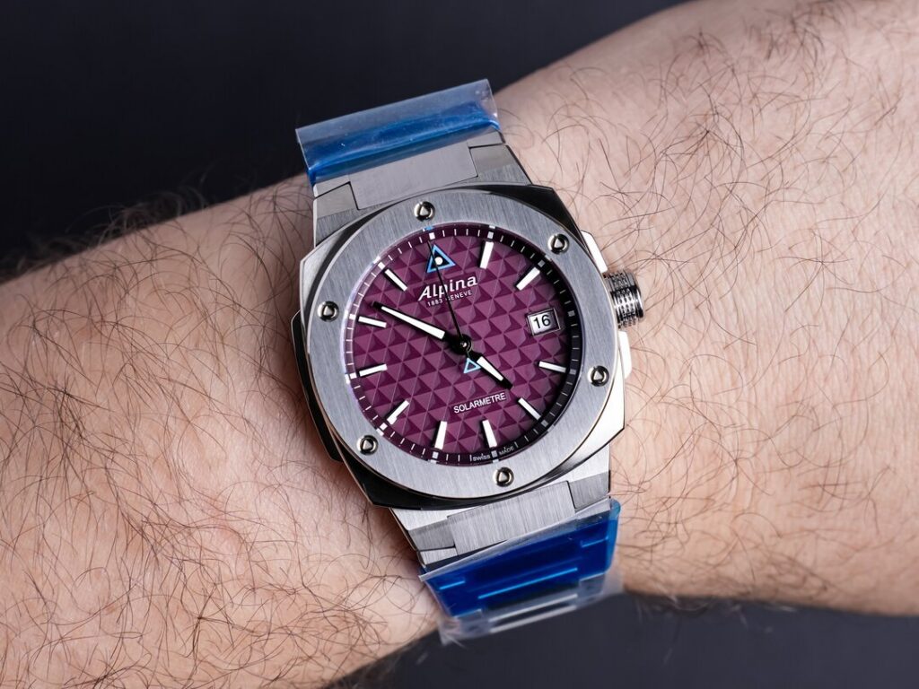 Was mir an der Solarmetre sofort gefallen hat: Man sieht ihr die Solar-Technik nicht an. Kein transluzentes Blatt, kein Technik-Showcase, kein offensichtlicher „Ich bin eine Solaruhr“-Moment. Stattdessen ein dynamisch aussehendes Zifferblatt mit dem typischen Alpina-Dreiecksmuster, applizierten Indizes und sauber ablesbaren Leuchtzeigern. Genauso, wie man es von der Alpiner Extreme Kollektion kennt und erwartet.
